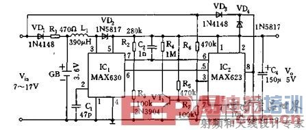 电池电压GB为3.6V,由三节AANiCd电池组成。IC1位开关稳压器,IC2位线性稳压器。当输入电压Vin》7.3V,IC1将关断,在此情况下有IC2提供输出电压。Vin则通过VD1和R1以浮充电流对GB进行充电。当Vin<7.3V时,IC2则处于关断状态,IC1将3.6V电池电压升到5V,负载电流为50mA。IC2带有低电池电压监测器,并由R6、R7对Vin进行检测。监测器在7脚的输出驱动倒相器VT1,VT1又反过来驱动IC1和IC2的6脚及5脚两个关断输入脚。这两个输入具有相反的极性电平。IC1和IC2公用反馈电阻R2和R3使两个稳压器对输出电压V0都能进行监测。当IC2关断,其输出被切断。当IC1关断,芯片维持低功率状态,消耗电流小于1微安。在工作状态IC1对50mA的负载提供75%的总效率。只要正确设定限流电阻R1的阻值,就能使浮充电流电荷量不超过电池容量的10%,Vin可高达17V。