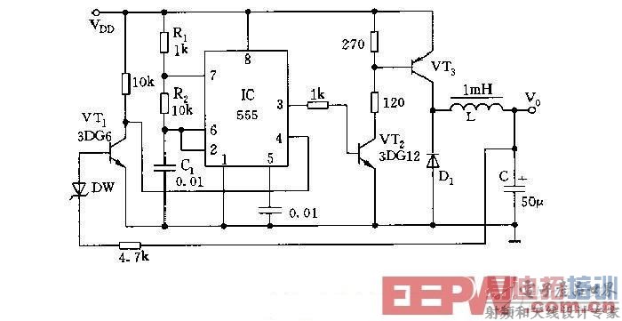 如图所示,555和R1、R2、C1组成无稳态多谐振荡器,振荡频率约在10kHz,占空比接近50%。VT2、VT3作为扩大电流用的开关管使用。当振荡方波为高电平时,VT2、VT3导通,向LC放电;为低电平时,L中的储能通过续流二极管回路向负载供电。当过压时,DW击穿,VT1饱和导通,c极呈低电平(<0.7V),使555复位、停振,起稳压和动态平衡作用。