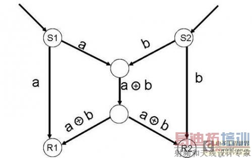 上图所示的网络中,源节点S1想把信息流ai传送给R1和R2。另一方面,源节点S2也希望在相同时间、以相同速度,把信息流bi传送给同样的接收节点R1和R2。假设每个路径每秒可携带一个位元,而且只能顺着箭号所指的方向前进。如果路由器只传输其所接收到的信息,那么中间链路将是个瓶颈,因为每秒总共接收到二位元的资料,但其容量只有一位元,路由器每秒只能传送一位元资料给中间链路,这种瓶颈会造成可怕的塞车。相反,如果把一般的路由器换成编码器,它可以把两个信息通过异或或者线性组合运算成单一位元输送给中间链路,并且发送ai+bi (或者ai和bi的任意线性组合),这样就轻而易举地解决了塞车问题[3][5]。