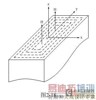 从图2-18可以看出,磁场强度由H = Hz:和Hx = Hy = 0组成;对于电场强度,其指向平行于Y轴为E = Ey,Ex = Ez = 0。因此,上面两式又可以改写为:
