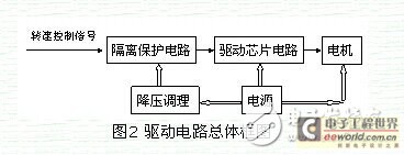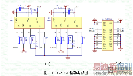 在机电控制系统中,大部分的控制信号是由微控制器输出的,如单片机、CPLD、DSP等。这些微控制器既要保证工作的稳定性,又要保证低功耗,所以这些控制芯片的工作电压都比较低,常见的是5V、3.3V、1.8V等,这些电压仅仅能够表示控制信号,不具有驱动较大功率负载的能力。由于本电路的目的是为了驱动智能车上的540电机,该电机具有大扭矩、大电流的特点,所以必须在控制信号和540电机之间增加驱动电路用来提高驱动能力,使单片机能够对电机进行控制。本文选择了BTS7960大电流低电压电机驱动芯片进行电路设计,设计的驱动电路总体框图如图2所示。