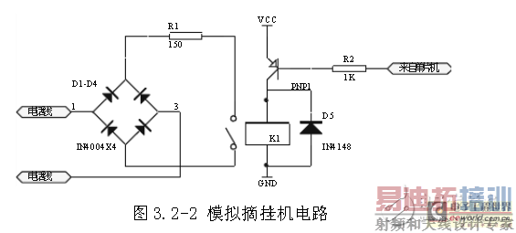 模拟摘挂机电路如图所示。平时电话挂机时,两条电话线处于开路状态,两电话线的电压为48V(部分电话为60V),加到电话机的振铃电路两端,当摘机时振铃电路断开,两电话线接通,阻值大约250Ω。当拨打电话号码时,来自电话线的高压振铃信号经铃流检测电路,通过光电耦合器在其二次侧形成方波脉冲信号送到单片机进行振铃脉冲进行计数,当振铃次数达到设定次数时,由单片机内部软件程序控制,控制摘挂机口输出一个低电平,然后电平送到三极管PNP1的基极,使三极管饱和此时,+5V电源经三极管,再通过继电器线圈接地,继电器线圈得电,使继电器的常开触电闭合,250Ω的电阻接入电路当中,电话接通。当用户输入密码错误,或者是操作结束后,系统由软件控制PNP1截止,继电器线圈失电,常开触点断开,电话线又处于开路状态,从而实现模拟挂机。