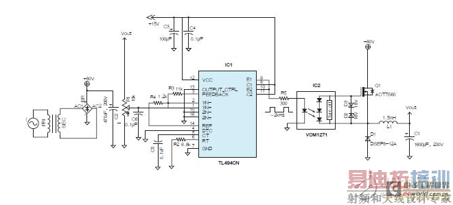电路原理:开关稳压器中使用了光电耦合器(VOM1271),该耦合器具有一个内置的快速关断器件。如果将200pF栅极电容连接至IC2,则开关时间(ton与toff)分别为53μs和24μs。有鉴于此,降压转换器选择了2kHz的开关频率。此处选用了德州仪器(TI)的TL494(IC1)作为脉冲调制控制器。考虑到栅极阈值电压(VGS(th))、总栅极电荷(Qg)、漏源电压(VDS)及漏极电流(ID)等因素,本例使用了AOT7S60 MOSFET作为开关元件。由于VOM1271能够提供约8.4V的电压,VGS(th)应远低于该值;Q1的VGS(th)为3.9V,当电压为8.4V时,可实现良好的导通性能。IC2无法提供更多电流(通常为45μA)。为确保开关速度并降低开关损耗,栅极电荷应保持低值。MOSFET的Qg为8.2nC。在根据图所示进行整流和滤波后,采用降压线路变压器输出测试降压转换器。输出电压通过可变电阻器R1在5V~70V范围内连续可调。