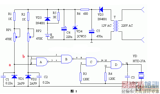 二极管VD1和VD2均置于恒温箱内,当箱内温度低于下限值时,图中a点电位大于门A输入端的阈值电压U,门A输出端为低电平,使门B输出高电平,这时由门C、门D组成的多谐振荡器起振,压电片发出报警声;当箱内温度高于上限值时,b点电位小于门 B阈值电压U,也可使门B输出高电平,压电片YD发出报警声。只有当箱内温度处于上、下限之间的值时,YD才不会发出声响。分别调节RP1和RP2的值可分别改变下限和上限值。电源电路为交直流两用电源,E是备用电源,当交流电源停电时,VD3导通,备用电源对电路供电,由于本电路耗电甚微,备用电源可用层叠电池,以减少体积。