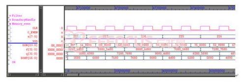 邊界處理器之規格如表3.2所列。DIN_1、DIN_2及DIN_3僅含有YU或YV,因此為16位元。DOUT_1、DOUT_2、DOUT_3、DOUT_4及DOUT_5僅含有Y或U或V,所以為8位元。C_EVEN是為了控制記憶體的讀寫動作,所以會把C_EVEN接至記憶體的輸入腳。