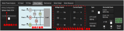 在《利用八通道示波器分析三相交流电》一文中,我们已经了解到如何用示波器测试三相电的有功功率、无功功率、视在功率以及功率因数等参数,对于电机功率驱动电路的输入和输出功率的测量也是相同原理。为了适应多种供电方式,HDO8000能够测量五种接线方式:单相两线制、单相三线制、三相三线制(两瓦特计和三瓦特计)、三相四线制。仪器界面会给出连线示意图,指导使用者如何连接被测信号。同时也提供火线-火线电压到火线-零线电压的转换。图4是设置界面示意。