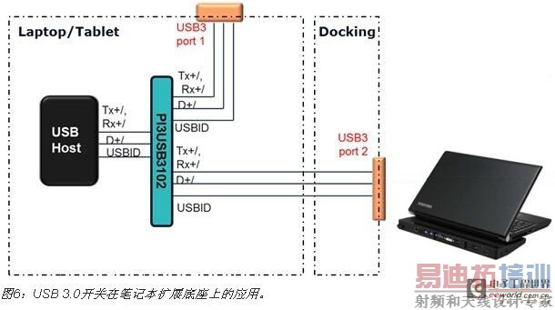 在笔记本扩展底座应用中,USB 3.0开关可用于在笔记本USB端口和扩展底座USB连接器之间实现切换(图4)。在该应用中使用USB 3.0 ReDriver,还可帮助恢复PCB、线缆和连接器上的信号完整性问题。