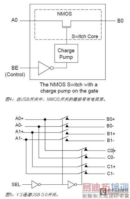 USB开关(多路复用/解复用器,Mux/De-Mux)是一种双向器件,从多路USB输入信号中选择一路(USB 3.0为Tx+、Tx-/Rx+、Rx-)传输到单根线路,或者是反方向传输。USB开关采用带电荷泵的NMOS管设计;电荷泵能够帮助提升栅极电压,避免输出电压受阈值钳位(图4、图5)。