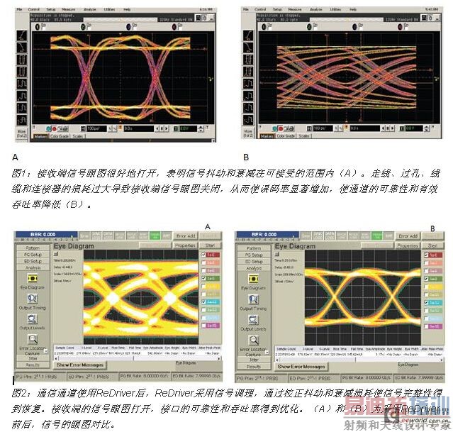 图1(A)中,发送端信号眼图很好地打开,并且信号抖动和衰减在可接受范围内。然而,通道内走线(标准FR4 PCB在12Gbps速率下损耗约为1.2dB/in)、过孔(每个达2dB)、线缆(根据线缆质量,在1.9~4.4dB/m之间)和连接器(0.5~1.5dB)所产生的总信号损耗太大,接收端信号眼图关闭,误码率显著上升(图1(B))。这降低了通道的可靠性和吞吐率。信号调理利用加重和均衡技术校正抖动和衰减损耗,为信号完整性恢复提供了一种方法。在通信通道内引入ReDriver或中继器后,ReDriver会对接收信号所产生的损耗进行校正,并对通道剩余部分会产生的损耗进行补偿。在采用ReDriver对信号进行调理后,接收端的信号眼图打开,信号和数据完整性得以恢复(图2)。这样,信号能够可靠传输更远距离,连接器的个数可以增加。