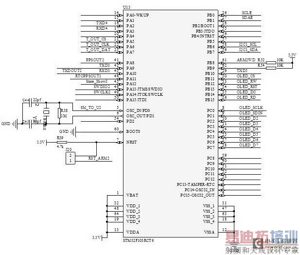 设计中使用的STM32F103RB具有扩展工业级的工作温度范围,可达72MHz的主频,可以实现在将UTC时间编码为IRIG-B时间的同时完成驱动OLED显示屏的功能。