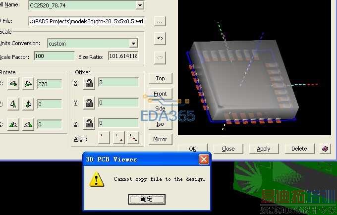 我的问题是在PADS 的3Dview里面,给封装分配一个wrl格式的3D封装总是不成功,至于比例问题,那个慢慢调就是了,你以前说把models3D放到PADS project中的root下面,我没有找到啥root的文件夹啊 ,我就放到PADS project下面了,弹出的错误说不能copy,而事实上cells文件夹下面却已经有了封装,搞不懂问题出现的状况啊,主要是用diptrace只能够导入pads 2005pcb的asc,9.3的不行,好烦人