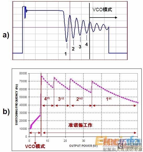 限 制开关频率的方法有两种:第一种是传统准谐振转换器所使用的带频率反走的频率钳位方法,即通过频率钳位来限制开关频率;但在轻载条件下,系统开关频率达到 频率钳位限制值时,出现多个处于可听噪声范围的谷底跳频,导致信号不稳定。为了解决这个问题,就出现第二种方法,也就是谷底锁定,即在负载下降时,在某个 谷底保持锁定,直到输出功率大幅下降,然后改变谷底。输出功率降低到某个值时,进入压控振荡器(VCO)模式,参见图1。具体而言,反馈(FB)比较器会 选定谷底,并将信息传递给计数器,FB 比较器的磁滞特性就锁定谷底。
