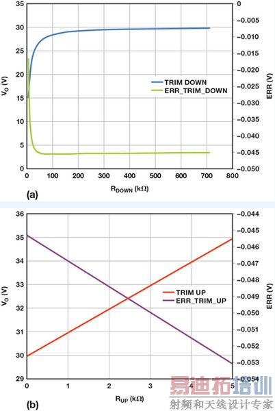 图6. 使用重新配置的反馈网络后,调整ADP1051输出电压的计算结果: (a)向下调整 (b)向上调整