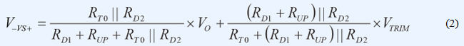 VS+引脚上的正常工作电压为1 V。若 VTRIM为1 V左右且RT0远大于RD2,则可忽略电路的其余分支部分。复合网络用作简单分压器,并调节RUP电阻值,提供类似于模拟控制器的特性,实现了模拟电源模块中的电压向上调整。