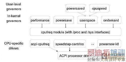 在 cpufreq 模块的底层,各个CPU 生产厂商只需根据其变频技术的硬件实现和使用方法提供与其 CPU 相关的变频驱动程序(CPU-specific drivers),例如 Intel 需要提供支持Enhanced SpeedStep 技术的 CPU 驱动程序,而 AMD 则需要提供支持 PowerNow! 技术的 CPU 驱动程序。