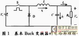 基本Buck变换器的电路原理图如图1所示。它主要由开关管S,续流二极管D,储能电感L以及滤波电容C组成。
