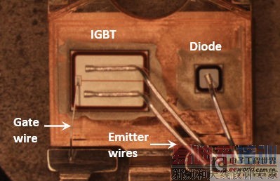 (图中文字说明:Gate wire 门极连线;Emitter wires 射极连线;Diode 二极管)