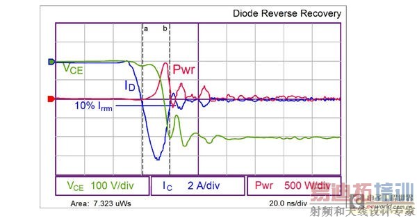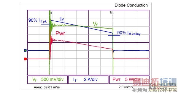 必须获取在开关周期的部分时段(此时电流为无功模式使二极管导电)时的二极管导通损耗数据。通常测量峰值、负及反向导电电流10%点的数据。