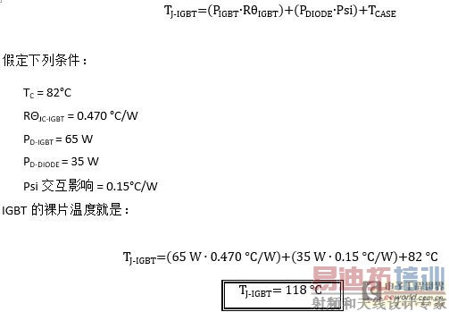 某些IGBT是单裸片器件,要么结合单片二极管作,要么不结合二极管;然而,大多数IGBT结合了联合封装的二极管。大多数制造商提供单个θ值,用于计算结点至外壳热阻抗。这是一种简化的裸片温度计算方法,会导致涉及到的两个结点温度分析不正确。对于多裸片器件而言,θ值通常不同,两个裸片的功率耗散也不同,各自要求单独计算。此外,每个裸片互相提供热能,故必须顾及到这种交互影响。