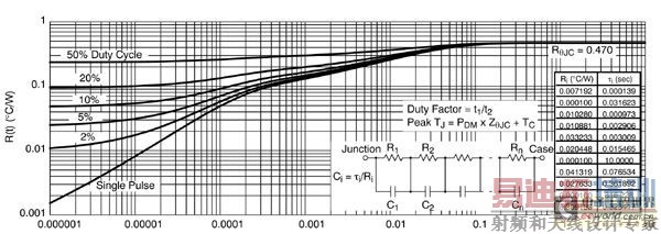 安森美半导体IGBT器件的数据表中包含IGBT及二极管θ值图表。稳态θ值如图7及图8中的图表所示。IGBT的θ值为0.470℃/W,二极管为1.06℃/W。计算中还要求另一项热系数,即两个裸片之间的热交互影响常数ψ。测试显示对于TO-247、TO-220及类似封装而言,此常数约为0.15 ℃/W,下面的示例中将使用此常数。