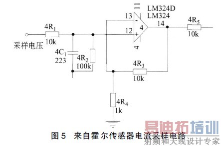 图5 中4R1接主电路上的霍尔传感器,有效地避免因变压器原边电流过流而可能出现烧坏主电路功率开关管的现象。为此,必须对流过MOSFET 开关管的脉冲电流大小进行采样。当发生过流时, 系统应能够快速反应做出相应的保护措施。流过MOFET 脉冲电流经开环霍尔电流传感器转换为电压信号,再经过简单RC 滤波和同相比例放大器得到需要的电流采样值。