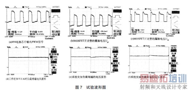 通过调压器在供电电源端输入110 V 的交流电压,使得系统稳定的工作在30 V、1 A 的负载下, 观察TL494 电源芯片输出的驱动信号波形、MOSFET开关管Ugs、Uds 、负载正常工作时的波形、以及突然加载、突然掉载情况,其试验波形如图7。