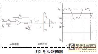 在UC3842的采样电压处接入一个射极跟随器,从而在控制电压上增加了一个与脉宽调制时钟同步的人为斜坡,它可以在后续的周期内将△I扰动减小到零。如图2所示,射极跟随器的信号从基极输入,射极输出,它具有高输入阻抗、低输出阻抗、输入信号与输出信号相位相同的特点。因此,即使系统工作在占空比大于50%或连续的电感电流条件下,系统也不会出现不稳定的情况。