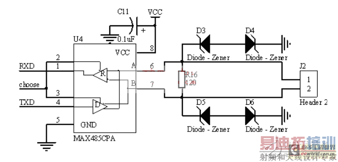 当然,上图并不是完整的485通信电路图,我们还需要在A线上加一个4.7K的上拉偏置电阻;在B线上加一个4.7K的下拉偏置电阻。中间的R16是匹配电阻,一般是120Ω,当然这个具体要看你传输用的线缆。(匹配电阻:485整个通讯系统中,为了系统的传输稳定性,我们一般会在第一个节点和最后一个节点加匹配电阻。所以我们一般在设计的时候,会在每个节点都设置一个可跳线的120Ω电阻,至于用还是不用,由现场人员来设定。当然,具体怎么区分第一个节点还是最后一个节点,还得有待现场的专家们来解答呵。)TVS我们一般选用6.8V的,这个我们会在后面进一步的讲解。