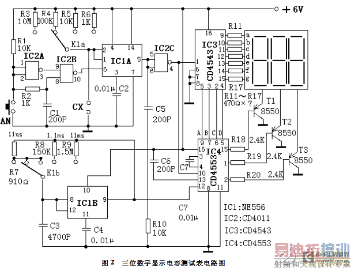 图2中,集成电路IC1B电阻R7~R9和电容C3构成基准脉冲发生器(实质上是一个无稳多谐振荡器),其输出的脉冲信号周期T与R7~R9和C3有关,在C3固定的情况下通过量程开关K1b对R7、R8、R9的不同选择,可得到周期为11μs、1.1ms和11ms的三个脉冲信号。 IC1A、IC2、R1~R6、按钮AN及C1构成待测电容容量时间转换器(实质上是一个单稳电路)。按动一次AN,IC2B的10脚就产生一个负向窄脉冲触发IC1A,其5脚输出一次单高电平信号。R3~R6和待测电容CX为单稳定时元件,单稳时间td=1.1(R3~R6)CX。IC4、IC2C、C5、C6、R10构成闸门控制器和计数器,IC4为CD4553,其12脚是计数脉冲输入端,10脚是计数使能端,低电位时CD4553执行计数,13脚是计数清零端,上升沿有效。当按动一下AN后,IC4的13脚得到一个上升脉冲,计数器清零同时IC2C的4脚输出一个单稳低电平信号加到IC4的10脚,于是IC4对从其12脚输入的基准计数脉冲进行计数。当单稳时间结束后,IC4的10脚变为高电平,IC4停止计数,最后IC4通过分时传递方式把计数结果的个位、十位、百位由它的9脚、7脚、6脚和5脚循环输出对应的BCD码。