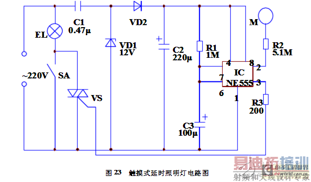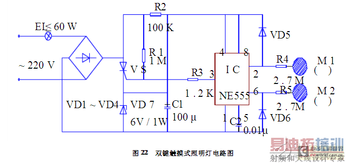 二、触摸式延时照明灯电路工作原理:在闭合SA时,台灯点亮,不受延时控制电路的控制。当断开SA时,如果触摸到电极片M时,通过R2将使得ICNE555集成电路的2脚的低电平触发端,3脚翻转为高电平,触发VS导通,台灯被点亮。此时,C3开始充电,当充电结束后,6脚变为高电平,3脚翻转为低电平,VS由于失去触发电流而处于截至状态,台灯熄灭。 220V的交流电压经过C1、VD2、VD1、C2后,使得C2两端能输出12V的直流电压,供给集成电路IC。