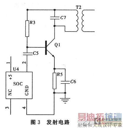 如图,主振电路采用2 MHz有源晶振作为振荡器。有源晶振输出的方波,经过二阶低通滤波器滤除高次谐波,得到稳定的正弦波输出,经三极管13003及其外围电路组成的丙类放大 电路后输出至线圈与电容组成的并联谐振回路辐射出去.为接收部分提供能量。测得与电容组成的并联谐振回路的空芯耦合线圈的线径为O.5 mm,直径为7 cm,电感为47 uH,载波频率为2 MHz。根据并联谐振公式得匹配电容C约为140 pF。因而.发射部分采用2MHz有源晶振产生与谐振频率接近的能源载波频率。