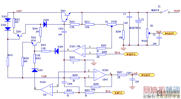 控制电路输送来的数字信号由D/A转换电路IC205转换成模拟信号作为基准电压,然后送到电压比较器IC201的正输入端。输出端取样电阻上取得取样电压信号送到电压比较器IC201的负输入端,与基准电压比较,比较结果由IC201的输出端反馈到T202,控制T202的导通状态。由D201、D202、R201、T203组成一个恒流源A,恒流值I=2Ud-Ube/R201 。T202的导通状态影响着对恒流源A的吸收电流,从而改变恒流源A对调整管T201基极的驱动电流,稳定调整管T201的输出值。为减小输出纹波,调整管T201使用达林顿三极管。调整管T201基极电流由一恒流源提供,进一步减小电源电压波动对调整管T201带来的影响。电路采用悬浮驱动。