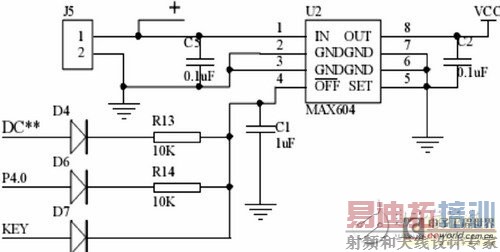电源模块由两部分组成,1AH的锂电池和电源稳压芯片MAX604。MAX604芯片是一种低压差、低功耗线性稳压器,用来保证系统工作电压的稳定。锂电池随着使用时间的增加,电量将会逐渐降低,不能有效保证系统稳定工作。因此在锂电池后端加一片MAX604,电压始终稳定在3.3V。MAX604芯片上的OFF端,可以用来控制稳压芯片是否输出电压。当OFF端上是高电平“1”时,该模块就有输出电压;当OFF端上是低电平“0”时,该模块就无输出电压。本系统利用这一个特性,实现电源的开关和休眠的唤醒。其硬件原理图如图2所示。