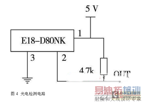 小车的光电检测电路采用E18-D80NK型号的光电传感器,它集发射和接受于一体,红外发射管向某一方向发射红外线,遇到障碍物后红外线被反射由接收管接受,从而判断出小车的前方是否有障碍物,对障碍物的感应距离可以根据要求通过传感器上的微调旋钮进行调节。传感器前端增加了透镜,利用聚焦作用远距离探测物体。传感器内部集成了放大、比较、调制电路,使传感器受可见光的影响较小,光电检测电路的连接图如图4所示。