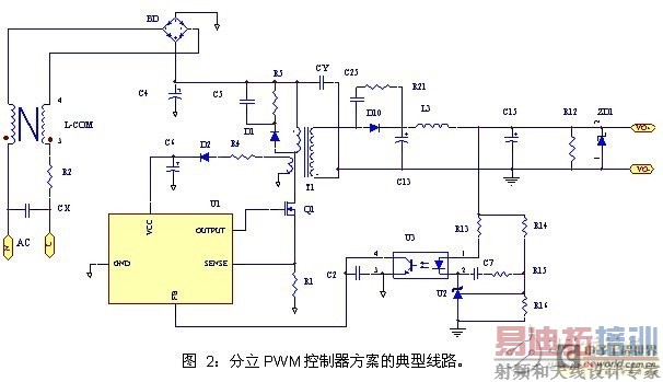 本文所讨论的低功率电源适配器主要针对输出功率5~15瓦的电源系统。主要有两类方案,即集成PWM控制器方案和分立PWM控制器方案。图1是集成PWM控制器的典型应用图,U1采用DIP-8封装,内部集成了PWM控制器和功率MOSFET。变压器输入侧电路包括:由X电容CX和共模电感L-COM组成的输入滤波电路,由BD组成的整流桥电路,由U1组成的控制及功率电路。变压器输出侧包括:二极管D10等组成的输出整流滤波电流;固定电压基准U2等组成的稳压反馈电路。该方案由于功率器件和PWM器件集成在一个封装内,故集成度较高,但散热设计难。图2是分立PWM控制器方案,U1多采用SOIC-8或SOT23-6, 内部只含PWM控制器,功率器件Q1是MOSFET。其余外围电路与集成PWM控制器方案相同。