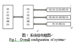 本直流电源监控系统采用集中管理,独立控制,主要适用于20~200AH单电单充系统,可实现24节电池巡检和30路支路绝缘监测。系统由综合监控模块、电池巡检模块、绝缘监测模块、充电模块以及上位机显示控制模块组成,其中电池巡检、绝缘检测通过RS485接口与综合监控模块联机。该直流电源监控系统采用集中一体式加扩展单元的组合结构,接线简单,安装方便。其结构如图1所示。
