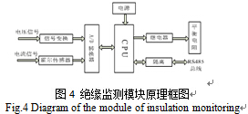 本绝缘监测模块具有检测30路支路绝缘电阻的功能,测量精度为±0.3KΩ,同时还能检测母线(合母、控母和母线负)对地电压,测量误差为±0.4V。绝缘监测模块将监测到的对地电压值和对地电阻值通过RS485总线发送给综合监控模块,并由综合监控模块作出相应处理。其原理如图4所示。
