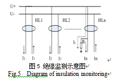 对于检测绝缘电阻,国内外主要有“电桥平衡法”、“低频探测法”、“检测支路漏电流法”等几种方法。本文采用检测支流漏电流的方式来判断绝缘电阻,无需在支路上注入交流小信号,因而不对直流系统产生任何影响,其原理如图5所示。