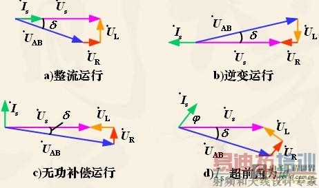 由于Ls的滤波作用,谐波电压只使is产生很小的脉动。当正弦信号波频率和电源频率相同时,is也为与电源频率相同的正弦波。us一定时,is幅值和相位仅由uAB中基波uABf的幅值,及其与us的相位差决定。改变uABf的幅值和相位,可使is和us同相或反相,is比us超前90°,或使is与us相位差为所需角度。