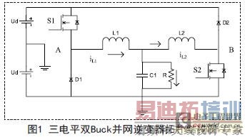 但是,由于没有变压器,输入输出没有电气隔离,光伏模块的串并联构成的光伏阵列对地的寄生电容变大,而且该电容受外界环境影响较大,由此产生的共模电流将会很大,对于漏电流的研究,现已有多种解决方案:当全桥逆变器采用单极性调制方式时,存在一开关频率脉动的共模电压,而采用双极性调制方式时,共模电压不变,其幅度等于母线电压的一半;在半桥逆变器中,对地寄生电容电压亦被输入分压大电容钳位在母线电压的一半,基本保持不变。这些都是基于桥式电路解决漏电流的方法,近年来出现了一种双Buck逆变器结构,这种逆变器具有无桥臂直通,体二极管不工作,双极性工作等突出特点,因而应用广泛。本文提出一种新型的三电平双Buck逆变器的方案,并制定相应的控制策略实现最大功率点的跟踪和并网控制。