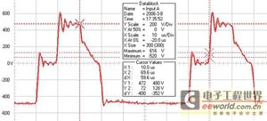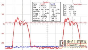 图3为负脉冲模式下的波形曲线,波形参数为T on=20μs,T off=10μs,图3中红线部分为有直流脉冲控制器输出的脉冲曲线,对于一个波形周期,电流工作时间为20μs,非工作时间,即电容充电时间为10μs,曲线表现出典型的方波特征,且处于工作状态时,电压相对平稳,曲线显示电压波动在±10V以内(保守估算)。图3中蓝色曲线为输入到脉冲控制器的电压波形,即电源本身输出的电压波形,其中最大电压为304V,最小电压为264V,这表明由直流电源输出的电压波动在±20V范围内,相对稳定性较差。
