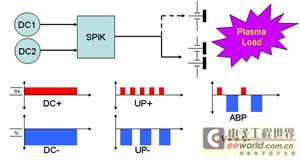 如图1所示,等离子能量的供应来自SPIK的大电容, SPIK提供固定电压及瞬间的高电流, 工作过程中激烈的能量反应由SPIK来承担。DC持续地对SPIK电容充电,SPIK可滤除DC的涟波,提供纯直流。控制器最高程控频率可达 50kHz,可自由调整脉冲时间控制参数T+on,T+off,T -on,T-off,快速电弧侦测、抑弧时间小于2 μs,多功能操作模式DC+, DC-,UP+,UP-, BP。