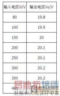 表1输出电压与输进电压的关系表(R4=400Ω,Po=20W)