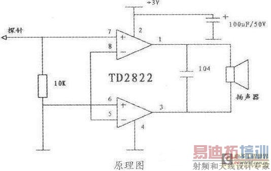 音频信号通过探针被送入功率集成块TD2822,将微弱的音频信号进行放大,放大过后通过1、3脚输出,驱动扬声器发声。在这里扬声器体积要非常小。