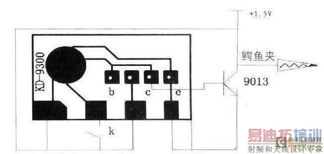音频信号发生器,外围元件少,只有一只三极管和一只开关,焊接时可将三极管直接焊在音乐芯片预留的孔上,然后从三极管集电极引出一根线路,用来连接鳄鱼夹,电源采用一节7号电池,平时电路电流极小,因而未设电源开关。当按下开关K时,电路被触发,三极管集电极便产生一个音频信号,通过鳄鱼夹输出。