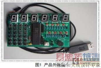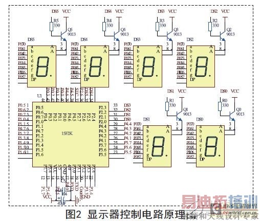 本显示器采用六个共阳极的数码管,按照通常的做法,六个数码管水平排列在产品的最上方,如图1所示,这样的设计可以方便的将控制系统的控制状态显示出来。下方采用的是40管脚DIP封装的单片机,所有并行口线都安排了插针,可以方便的实现系统的外部扩展,增强本显示器的可移植性。
