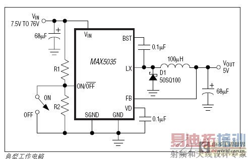 MAX5035 是易于应用的高效、高压、降压型DC-DC转换器,使用高达76V输入电压工作,空载时仅消耗270μA静态电流。这款脉宽调制(PWM)转换器重载时工作在125kHz固定开关频率,轻载时自动切换至跳脉冲模式以保证低静态电流和高效率。MAX5035包括内部频率补偿,可简化电路设计。器件使用内置低导通电阻、高电压DMOS晶体管来获得高效率,降低系统称本。芯片包括欠压锁定、逐周期电流限制、打嗝模式输出短路保护和热关断功能。
