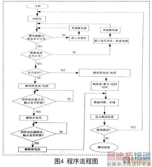 系统利用LabVIEW软件程序控制研华功能板卡。通过研华功能板卡控制程控电压源,使它输出电压,此电压被送于被测继电器的线圈。逐步升高或降低输出电压,同时监测继电器的常开常闭触点状态,当产品的触点状志转换时,将此时程控电压源电压回读端口的电压值读出,即测得吸合/释放电压。