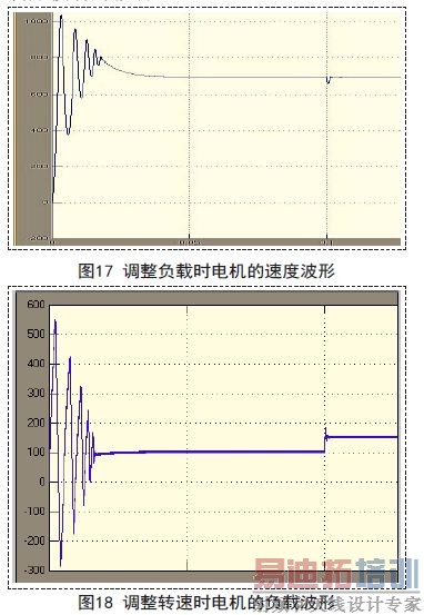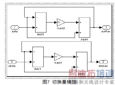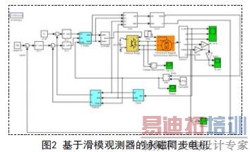 永磁同步电机无传感器矢量控制的系统结构框图,在MATLAB/Simulink下建立PMSM驱动仿真分析,用id=0时的无传感器矢量控制系统的仿真模型如图2所示,各个模块介绍如下:给定的参考转速是700rpm;速度通过PI调节模块,实现转速的闭环控制策略,该调节采用了输出限幅;接着是电流PI调节器模块构成电流的闭环控制,输出了定子的电压dq轴分量ud和uq;I-park逆变器模块将两相旋转直角坐标系(dq)下的值向两相静止坐标系(αβ)下变化,它的输出是αβ轴的定子电压分量参考值Ualfa,Ubeta;SVPWM和逆变模块用于实现参考电压逆变及其调制,从而可以直接通给电机;PMSM是永磁同步电机模块,负载转矩是模块Tm.反馈通道模块有: