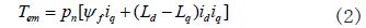 式中,三相绕组的相电压瞬时值分别为A u 、B u 、C u ; A i 、B i 、C i 是相电流的瞬时值; s R 是永磁同步电机定子的每相绕组电阻; A ψ 、B ψ 、C ψ 是永磁体的磁链在各相绕组的投影。在d-q旋转坐标系下的电磁转矩方程为: